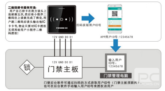 門(mén)禁管理員也可以只授權用戶(hù)的IC卡,由用戶(hù)自己使用IC卡來(lái)綁定自己的小程序二維碼,這樣用戶(hù)在讀卡器上刷二維碼之后,讀卡器輸出的是該用戶(hù)IC卡的卡號,舊小區升級改造非常方便省事,用戶(hù)只須用自己原有的IC卡在讀卡器上綁定自己小程序二維碼就可以使用了,無(wú)須物業(yè)操作,也不占用門(mén)禁的存儲空間。