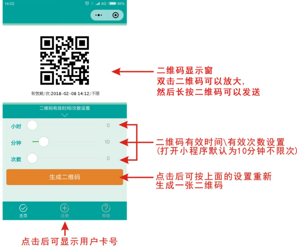 5、讀卡器自帶訪(fǎng)客功能,來(lái)了客人時(shí),業(yè)主可以用微信小程序生成一個(gè)有時(shí)效(1分鐘~24小時(shí)可設)和次數(1~9次可設)的二維碼圖片,截屏后用微信、QQ等工具發(fā)送給客人手機,客人就可以在設定的時(shí)間和次數以?xún)人⒋a開(kāi)門(mén)。